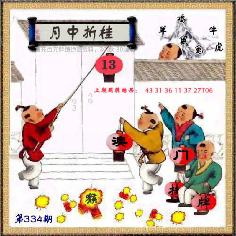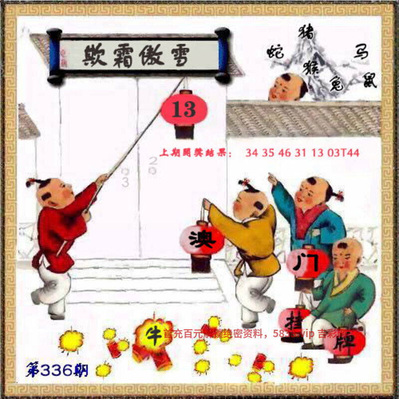 334期:澳门传真: 今期生肖三十开,定时定候提醒你。 四下五上是灵码,特码四五不用查。 三千佳丽住后宫,火中有肖是五七。 二六想合一七开,元帅军中点兵将。 宽宏大量 今期四下五上是灵码,解四头特码40-49,火中有肖是五七,解火肖蛇马。 综合:鸡蛇鼠兔牛羊虎猴狗 |